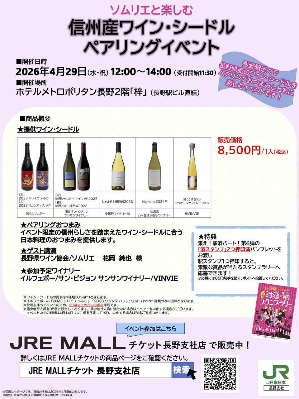 JR東日本長野支社が主催するスタンプラリー企画。駅スタンプ1つと酒蔵・味噌蔵・ワイナリー・ブルワリー・蒸留所をめぐり税込み 1,000円以上の商品購入または飲食で押印される「酒スタンプ」2つを集めて応募すると、抽選で素敵な賞品が当たります。