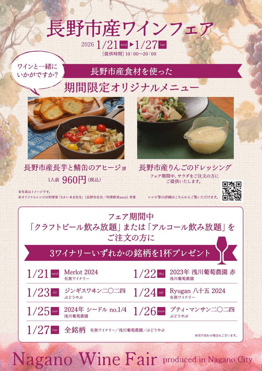長野市産のぶどうを使ったワインと、ワインに合うオリジナルメニューを用意するほか、長野市産ヘーゼルナッツのプレゼントも用意。
