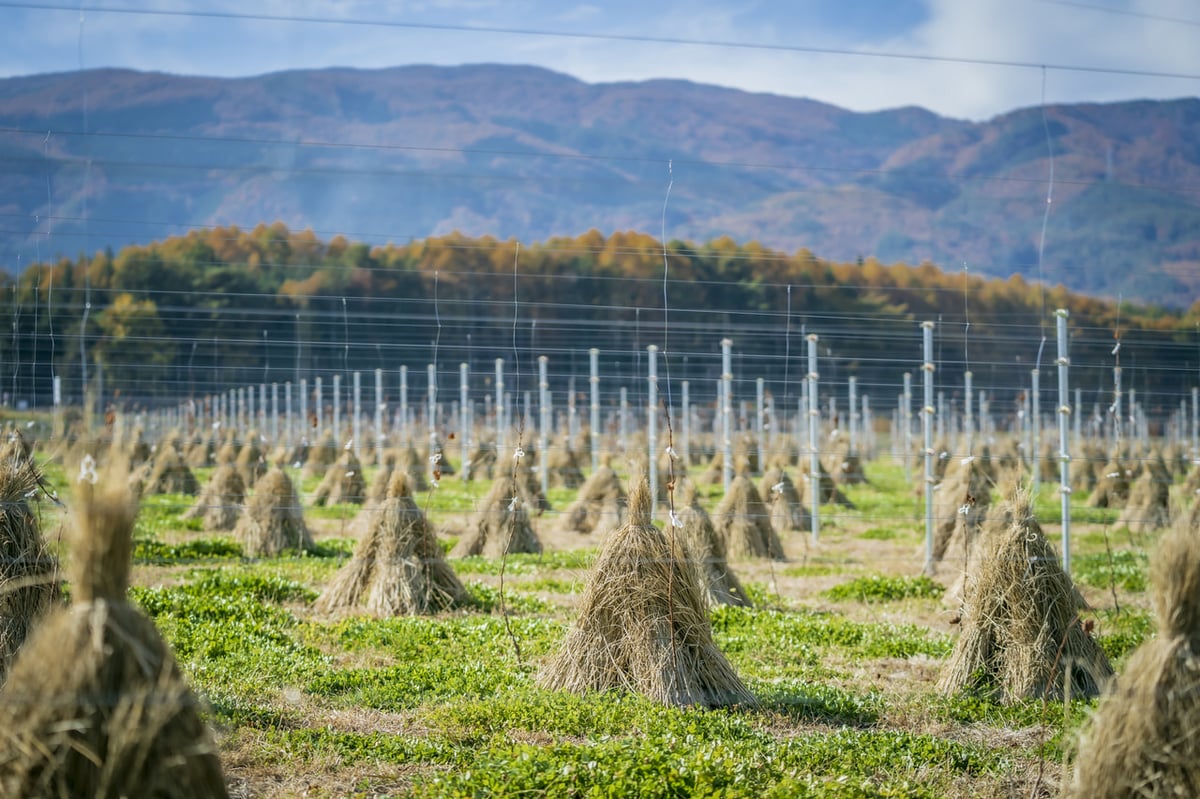 原村の冬は最低気温がマイナス15℃ほどになるので、ぶどうの木にワラを巻いて冬越しさせます。シャルドネやソーヴィニヨン・ブランなどいくつかの品種は標高の高い場所でも完熟することがわかってきました。夜温が下がるので、ぶどうの酸が落ちることなく、完熟するまで収穫を長くひっぱることができます。そのため、より香り高いぶどうが収穫できるのではないかと期待しています。
