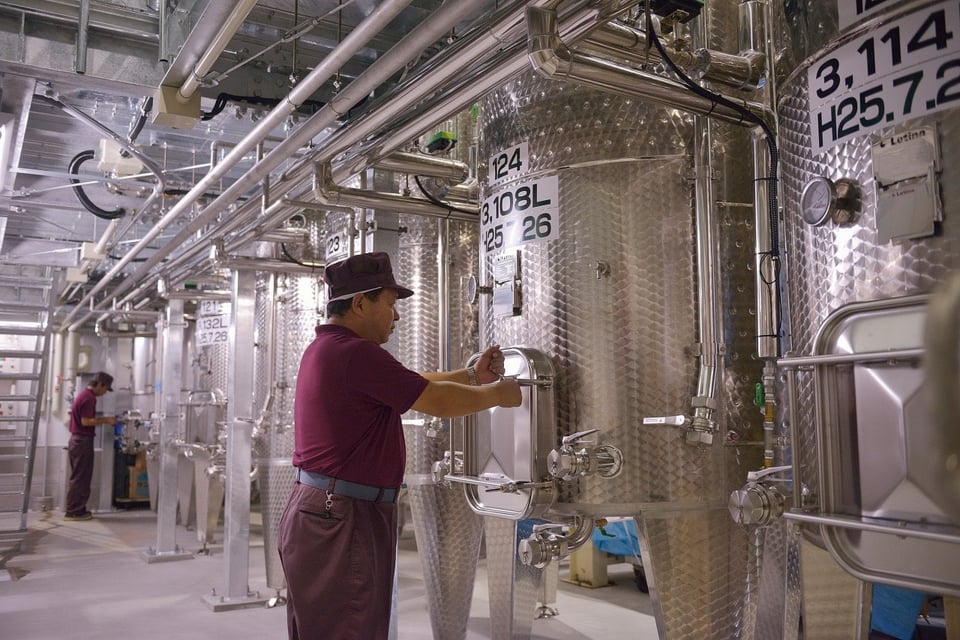 2013年にはワイナリーの建て替えが行われ、醸造設備が刷新されました。最新式の選果台が導入され、ぶどう果粒が厳選できるようになりました。それまで据えられていた10〜20キロリットルの醸造用タンクは、3〜5キロリットルの小型タンクに置きかえられました。