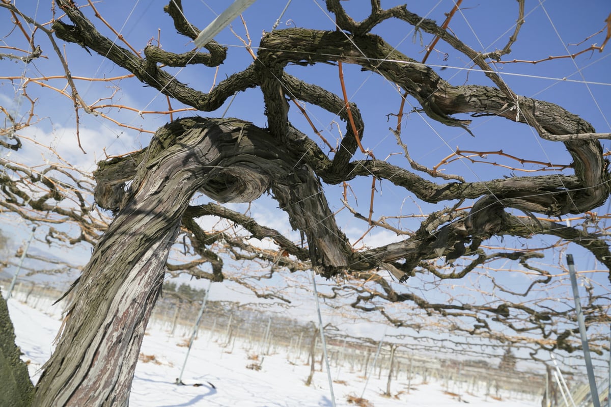 ヨーロッパで育まれたワインづくりを、気候風土の異なる日本で行うのは並大抵の事業ではありません。まして冷涼な桔梗ヶ原での栽培には、幾つもの壁が立ちはだかっていました。ワイン用ぶどうの中では寒さに強いメルローを選んだ林さんですが、桔梗ヶ原の冬はひときわ厳しく、春になっても芽が出ないなど、凍害や病害虫との闘いが続きます。