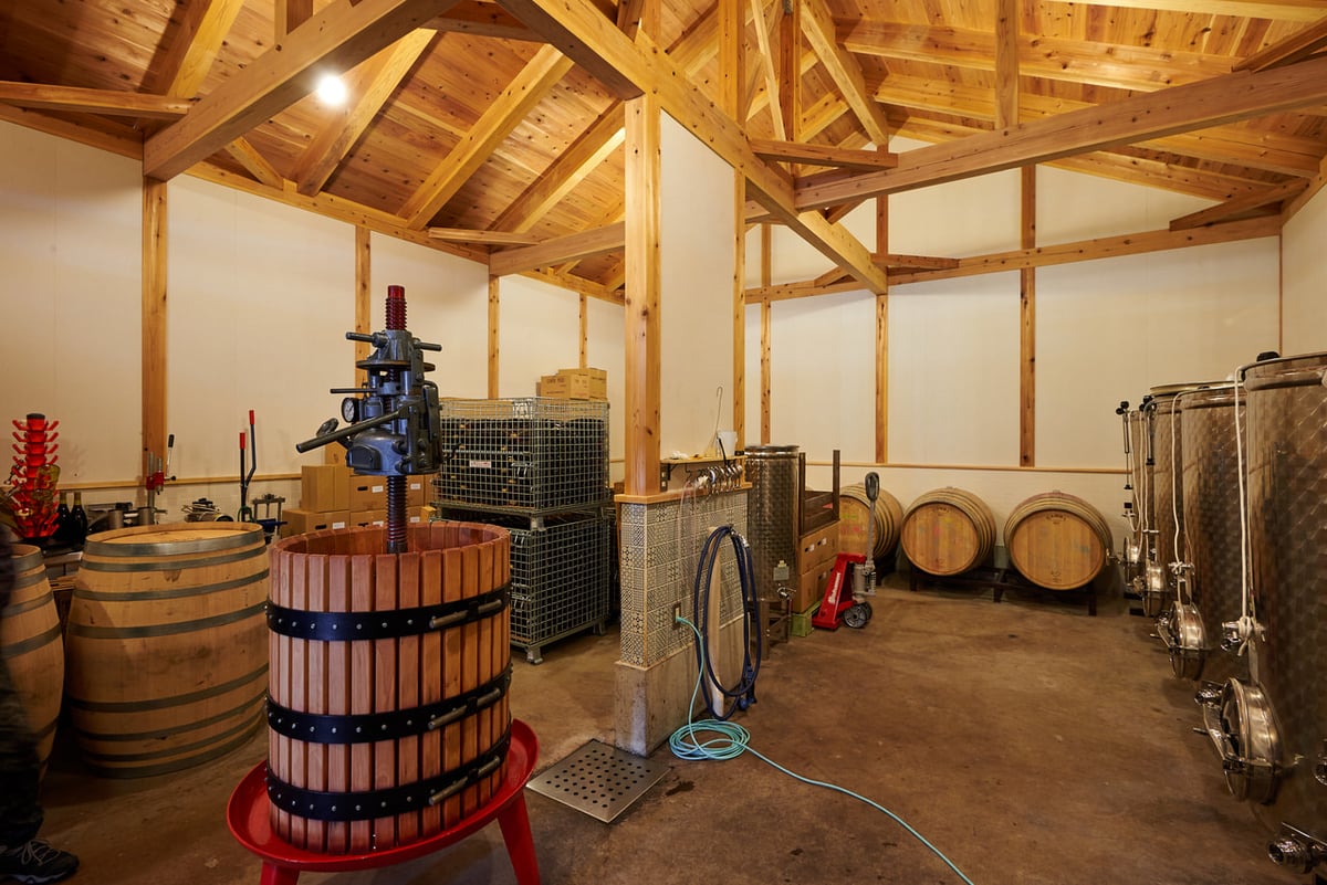 ワイナリーのなかに置かれているのは、シンプルでクラッシックなステンレススタンク、オーク樽やアカシア樽、木製のバスケットプレス。「めんどくさいことをしていると思われるかもしれないが、自分の手でやりたいので」と、自動制御の装置はありません。