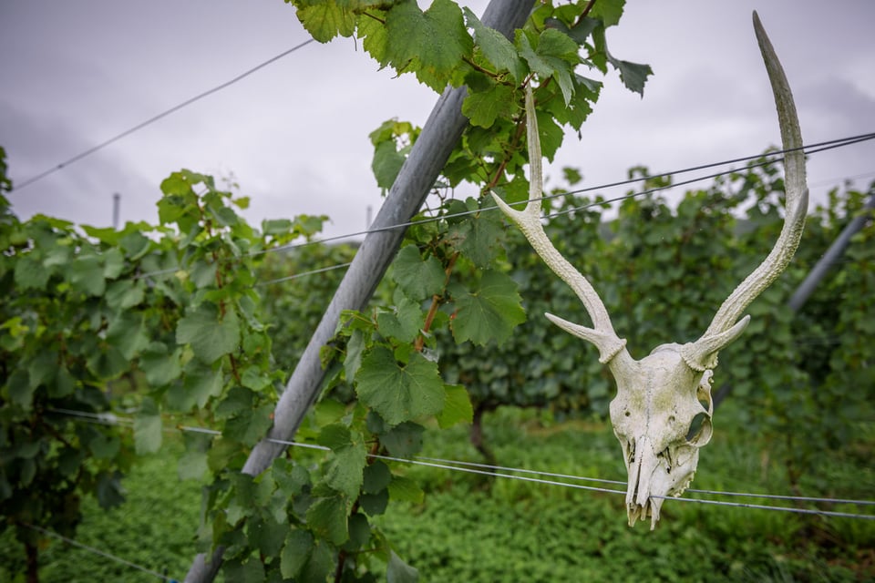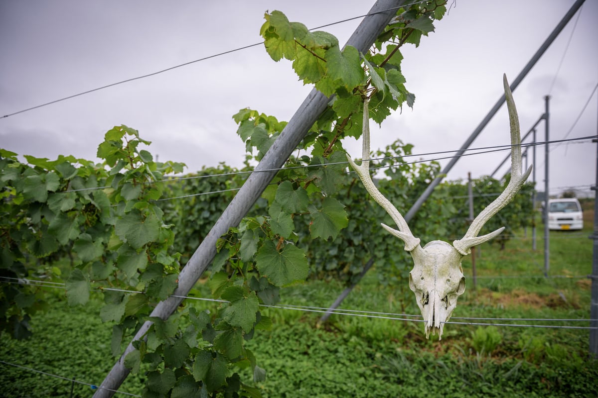 農園主の波田野信孝(はたの・のぶたか)さんに、収穫を目前に控えたシャルドネとメルローのブドウ畑を案内していただきました。すると、たわわに実ったシャルドネの伸びた枝の先に現れたのは鹿の頭蓋骨。「畑を掘っていたら出てきたので、支柱に飾りました」と、面白そうに笑います。