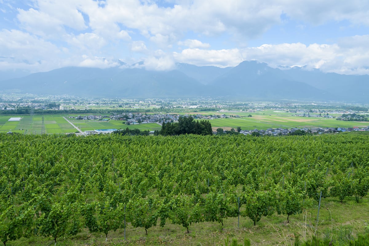 西は急峻な北アルプス、東はなだらかに広がる中山山地に囲まれ、風向きは南北に偏っています。夏の夕方、北アルプスから吹き下ろす北寄りの風によって夜の気温が下がり、1日の寒暖差が大きく、良質なぶどうを育みます。