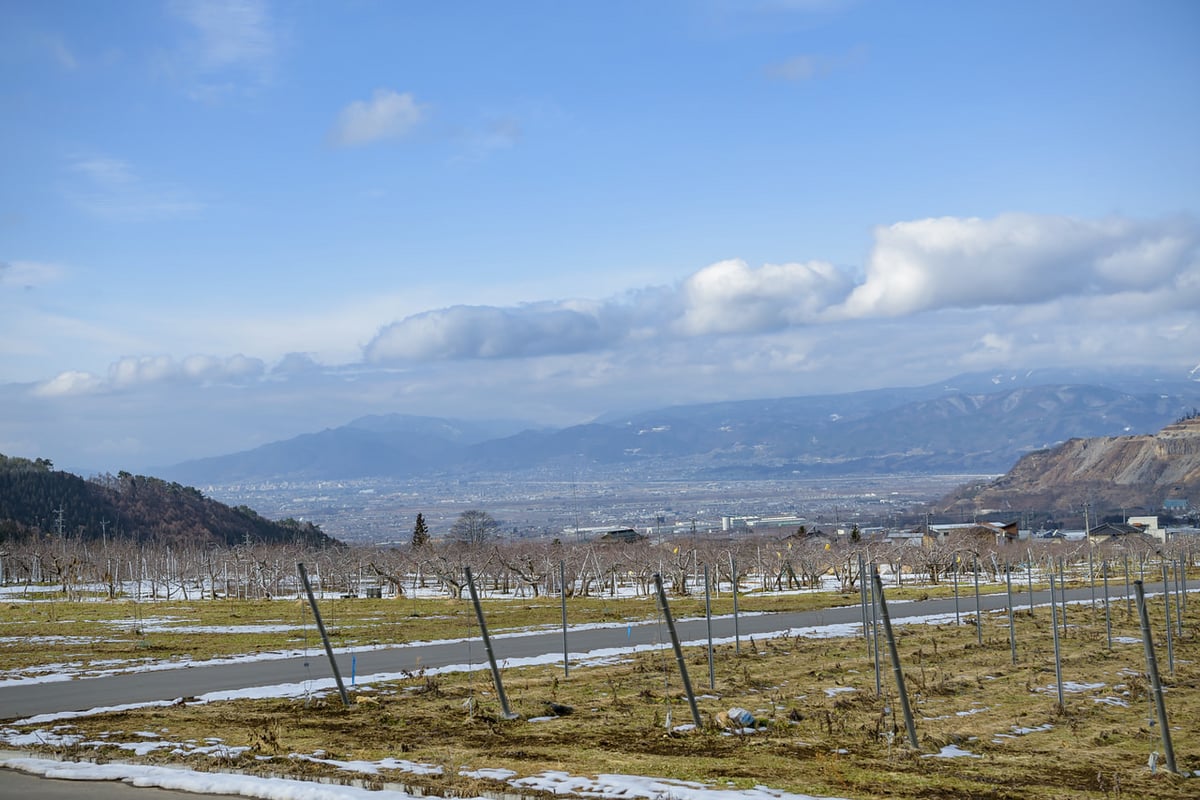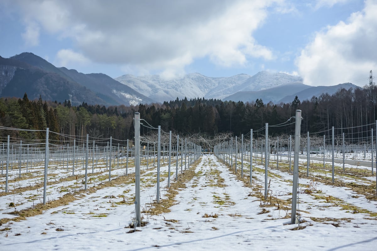 ワイナリーが立つのは標高680mの黒部地区。2014年から整備の始まった圃場に囲まれ、北信五岳と北アルプスを望みます。