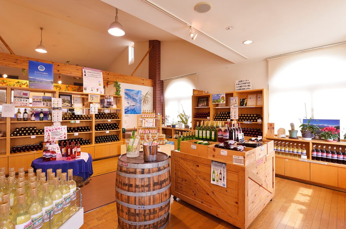 目の前に北アルプスの美しい山容が迫るのどかな田園風景のなかに、あづみアップルスイス村ワイナリーはあります。ここで醸されるワインは、ほぼすべてが地元産のぶどうを原料にしています(ごく一部に飛騨高山産のヤマブドウを使用 )。自社畑のある安曇野市三郷地区や契約農家が支える池田町青木原、最近では大町市にも畑は広がっています。