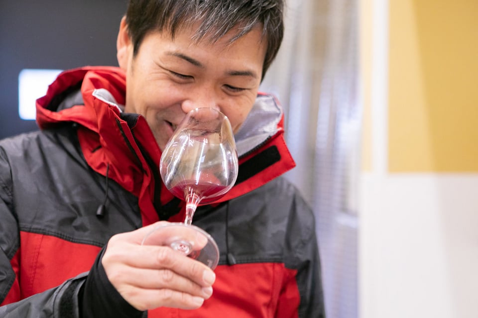 かおりさんとともに醸造を担うのが小山晃司さんです。小山さんはもともと坂城町の和平高原でりんご栽培やみそ醸造に従事していましたが、一貫してものづくりに携わりたいと東御市のワイナリーに転職。そこで栽培から醸造、営業まで、ワインにまつわるあらゆることに携わりました。成澤さんが地元にワイナリーを設立することを知り、帰郷。今では北村夫妻とともに畑に立ちつつ、醸造部門を支えています。