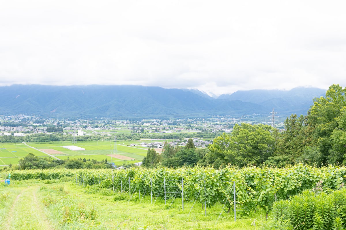 北アルプスの常念岳を正面に見据える西向きの斜面、10ヘクタールがワイン用ぶどうの畑となり、そのうち1.5ヘクタールがルミリュウの自社畑となりました。