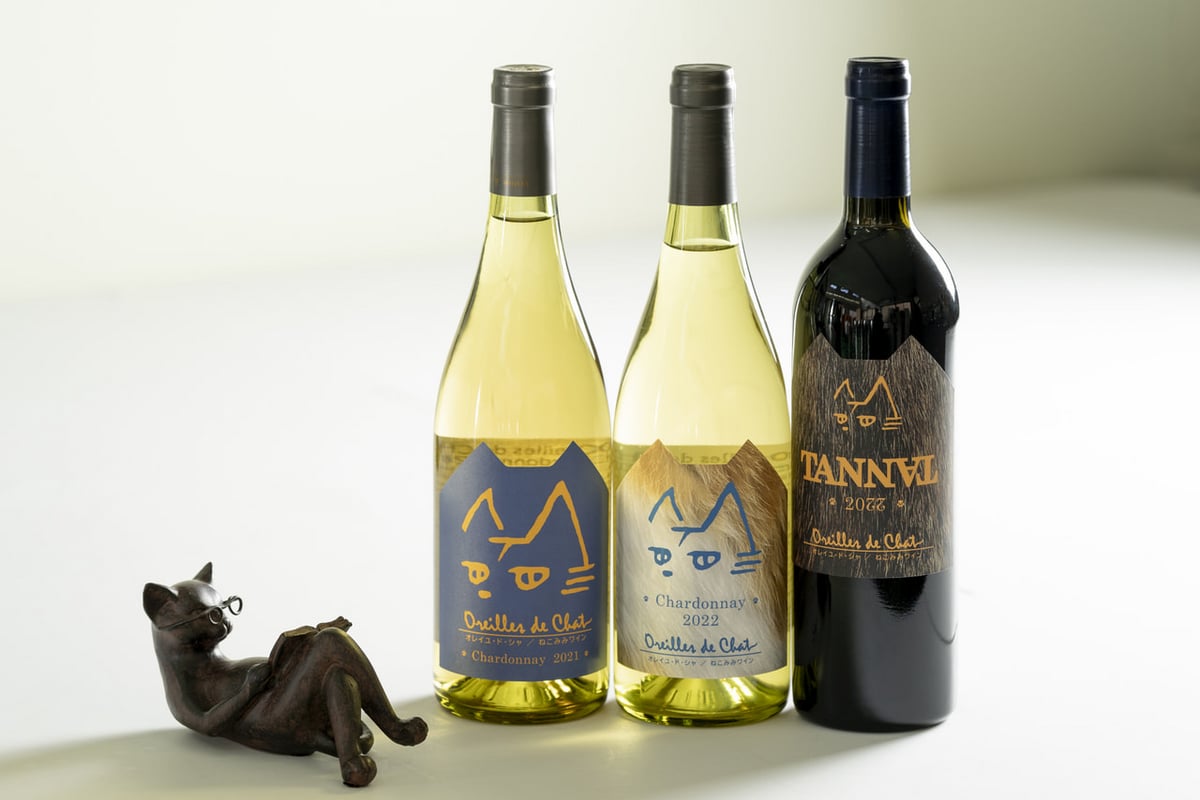 ワイナリー名の「オレイユ・ド・シャ」はフランス語で「猫の耳」のこと。自社畑から見える小泉山(こずみやま)と大泉山(おおずみやま)を猫の耳にたとえて名づけました。民話『でいらぼっち』にも登場する地元に愛される山で、小出さんが最初に植栽した畑は猫の額の部分に位置しています。