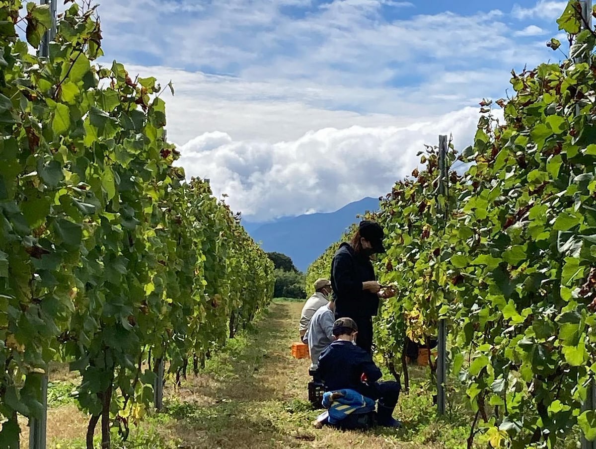 2023年10月、地元の「蓼科東急ホテル」とコラボレーションしたイベントは大盛況でした。宿泊客に収穫を手伝ってもらい、できたワインを返礼品として送るという、宿泊と収穫体験がパッケージになったツアーで、ホテル側から申し出があって実現したイベントです。自分が収穫したぶどうも使われたワインが自宅に届くという楽しみに加えて、数種類のワイン用ぶどうを試食できたので、さらに喜ばれたといいます。
