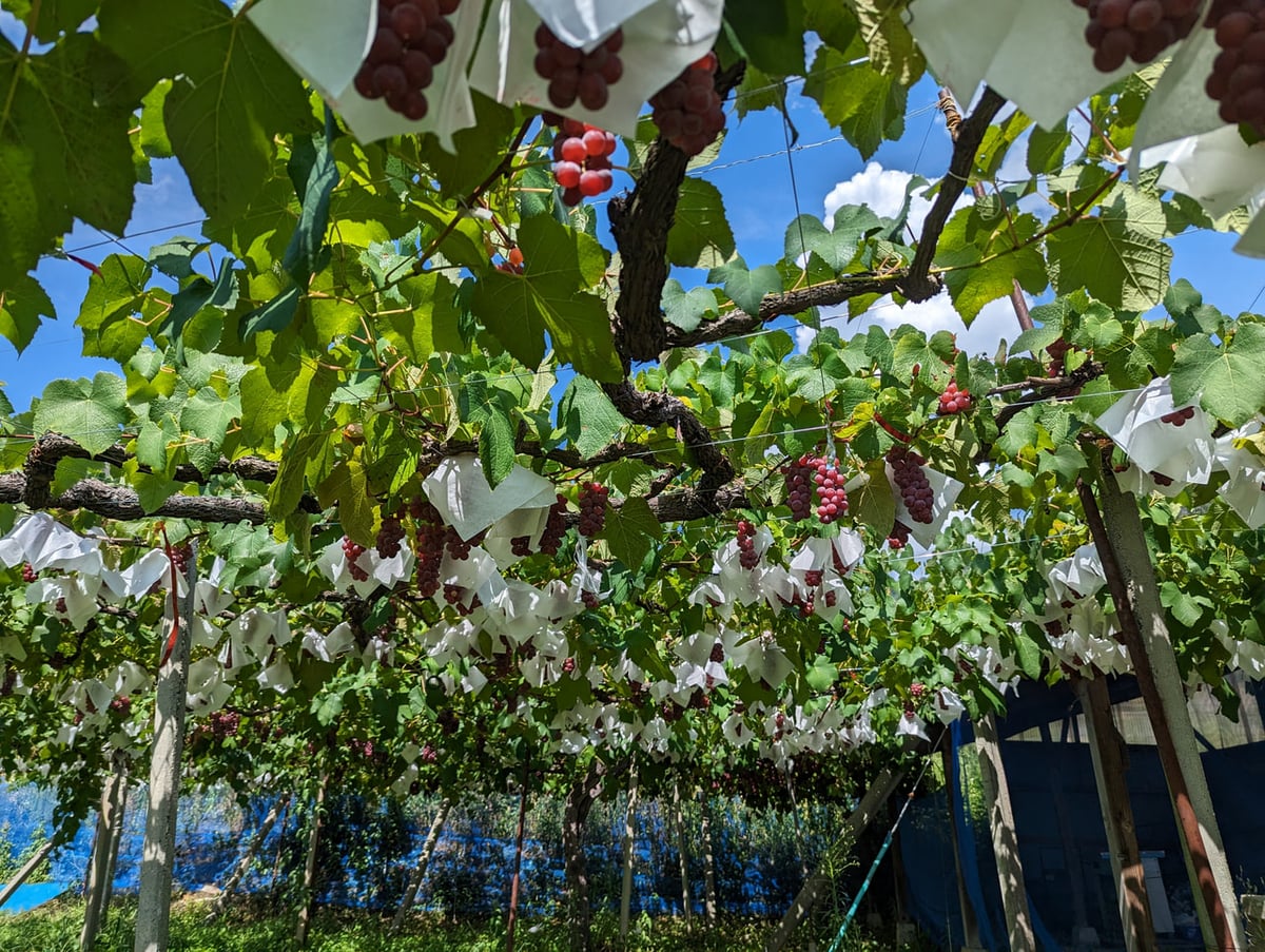 標高630〜730mに点在する自社畑は合わせて0.8ha。ナイアガラやデラウエアに加え、メルロー、シャルドネ、ソーヴィニヨン・ブラン、ピノ・グリ、ピノ・ノワール、竜眼など全部で14種類を栽培しています。今まで旅館で提供してきたNAGANO WINEに引けを取らないワインを⽬指し、2025年の初収穫を楽しみにしています。