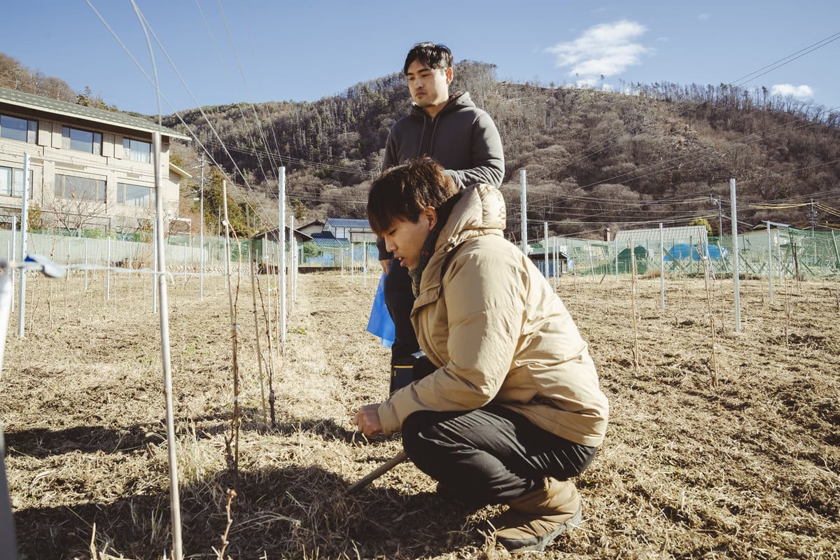 吉田健人(右)1991年、埼玉県生まれ、千葉県育ち。2018年、実家が松本に移ったことを機に移住。東京の飲食店勤務時からワインに興味があり、ワイナリーの栽培醸造主任に。旅館スタッフも兼任する。